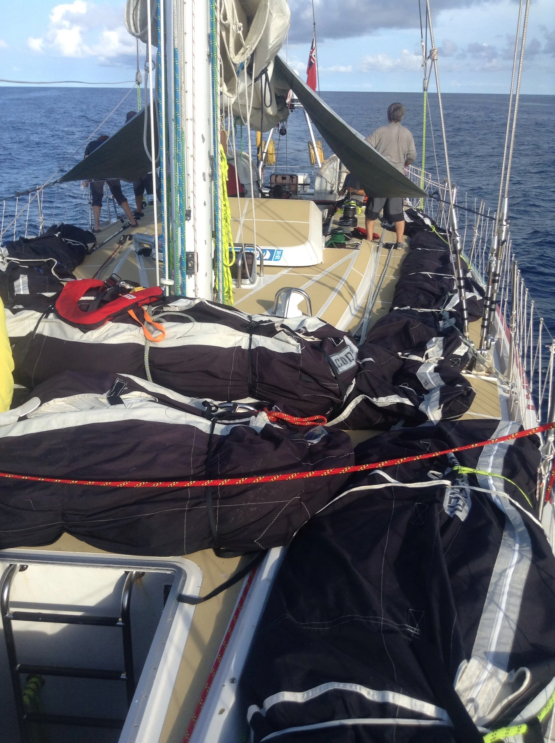 The sails were brought up from the sail locker so they could be inspected and repaired as needed.